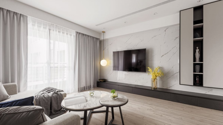 设计理念:客厅处采用原木作为地板,烘托自然、日常的生活氛围。在客厅的墙体上采用白色与大理石作为主题基调,两者相互点缀装扮,让整个空间显得纯净有质感。